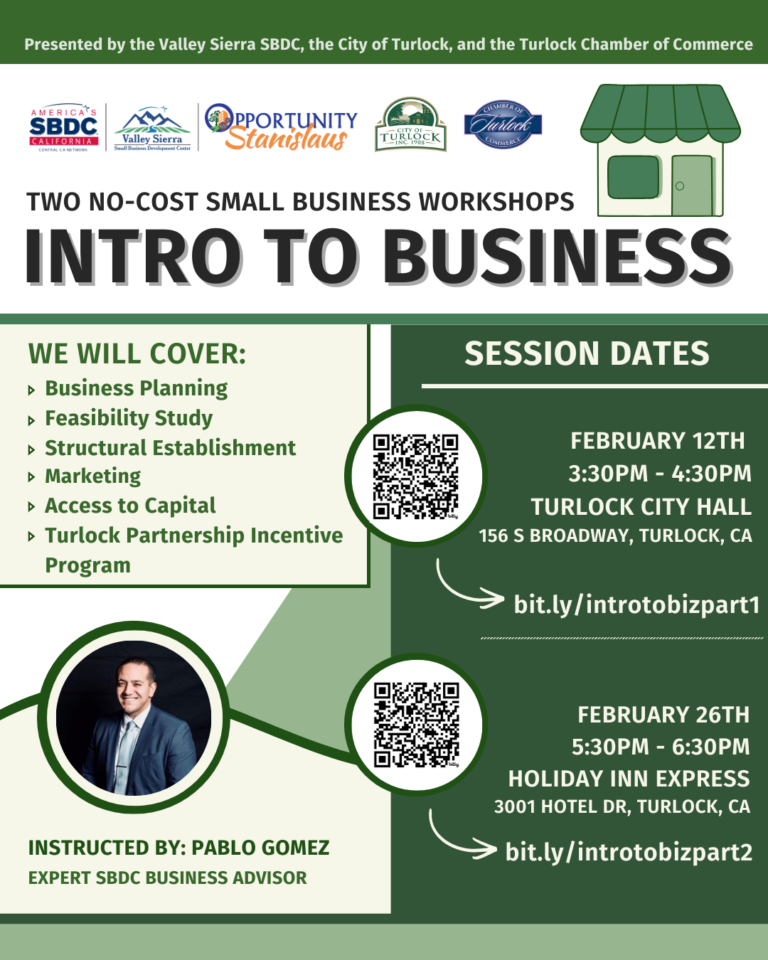 Join us for a free Intro to Business Workshop, presented by the Valley Sierra Small Business Development Center, in partnership with the City of Turlock and the Turlock Chamber of Commerce!